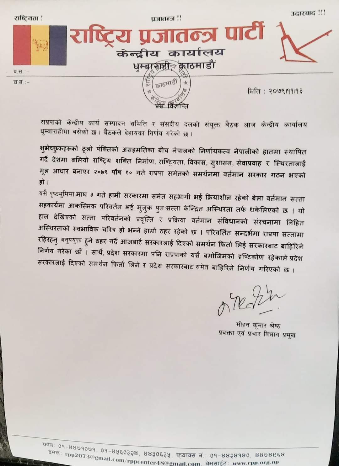 शनिबार बिहान पार्टी कार्यालय धुम्बाराहीमा बसेको राप्रपाको केन्द्रीय समिति र संसदीय दलको संयुक्त बैठकले सरकारलाई दिएको समर्थन फिर्ता लिने र सरकारबाट बाहिरिने निर्णय गरेको महामन्त्री शरदराज पाठकले जानकारी दिए।