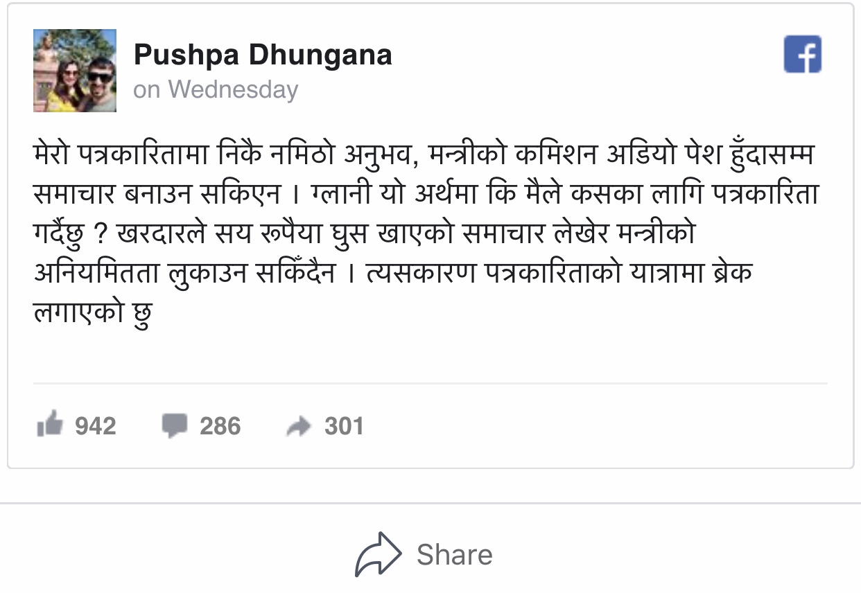 सामाजिक संजालमा एक पोष्ट लेख्दै पत्रकार ढुंगानाले भनेका छन्, ‘मेरो पत्रकारितामा निकै नमिठो अनुभव, मन्त्रीको कमिशन अडियो पेश हुँदासम्म समाचार बनाउन सकिएन ।