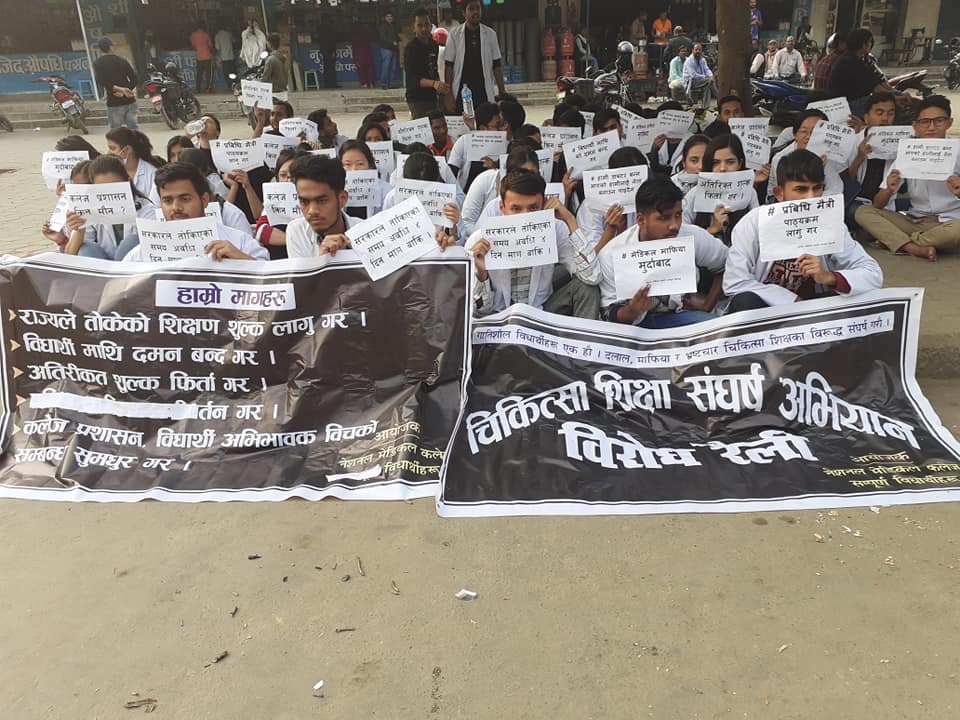 शुक्रबार राति करिब ८ बजेको समयमा नेशनल मेडिकल कलेजमा एमबिबिएस अध्यनरत विद्यार्थीले वीरगन्जको सडकमा मेडिकल माफियाको लडाइँमा वीरगन्जवासीको साथ मागेका छन् ।