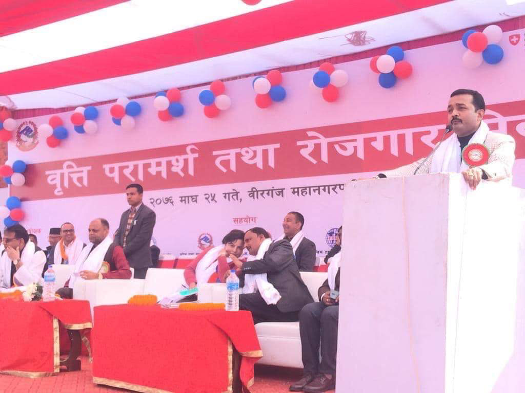 शनिबार वीरगन्जमा आयोजित बृति परामर्श तथा रोजगार मेलाको उदघाटन कार्यक्रममा बोल्दै सांसद यादवले तालिम लिएको युवाहरुलाई सरकारले शुन्य व्याजमा ऋण उत्पलब्ध गराए मात्र बेरोजगारी काम हुने बताउँदै उनले बेरोजगारीलाई न्युन गर्नको लागी प्रदेश नं. २ मा पहिलो पटक वीरगंज महानगरपालिकाले बृति परामर्श रोजगारी मेलाको आयोजना गरेकोमा महानगरको निकै प्रसंशा पनि गरेका थिए ।