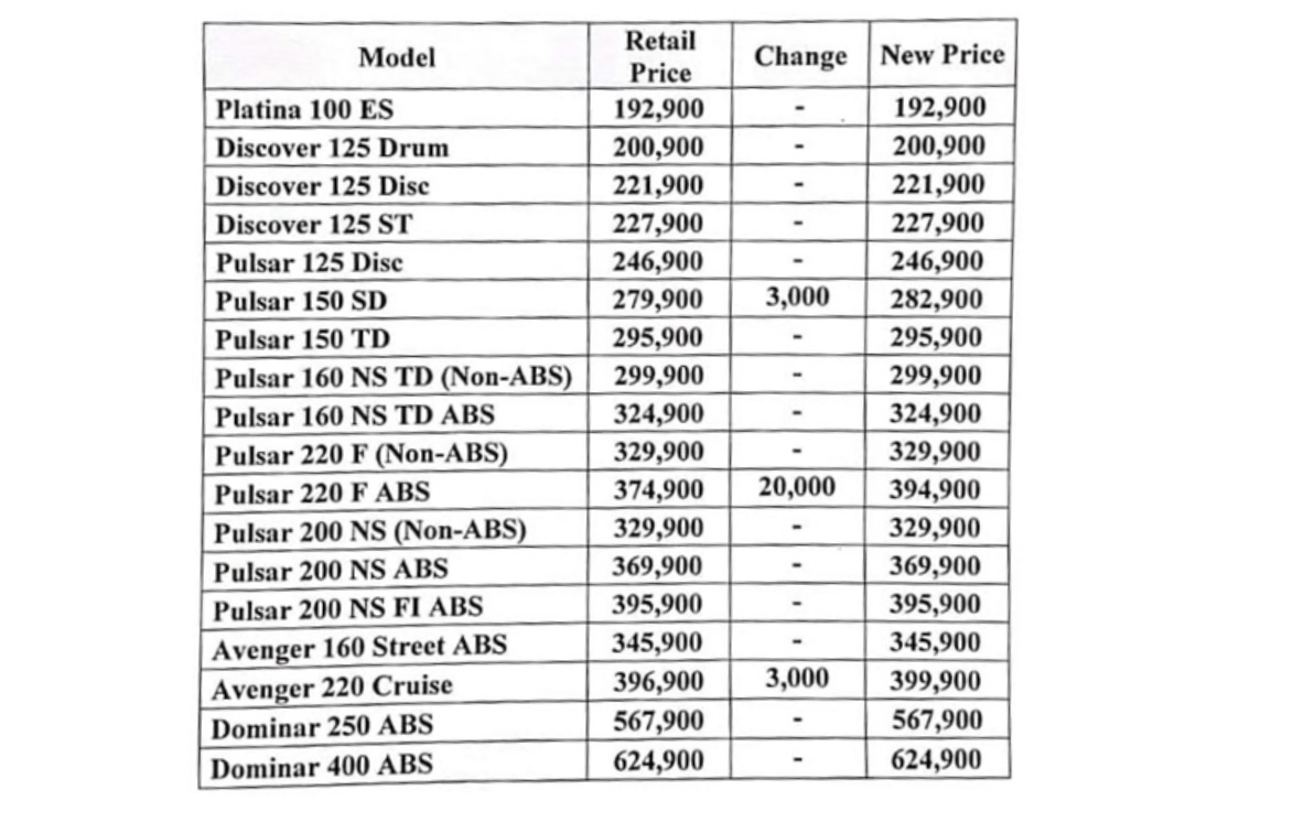 आजदेखि लागू हुने गरी बढेको मूल्य अनुसार १५० सिङ्गल डिक्समा ३ हजार, एभेन्जर २२०मा ३ हजार र सर्वाधिक बिक्रीहुने २२० एफलमा एकैपटक २० हजार रुपैयाँ मुल्य बढेको छ ।