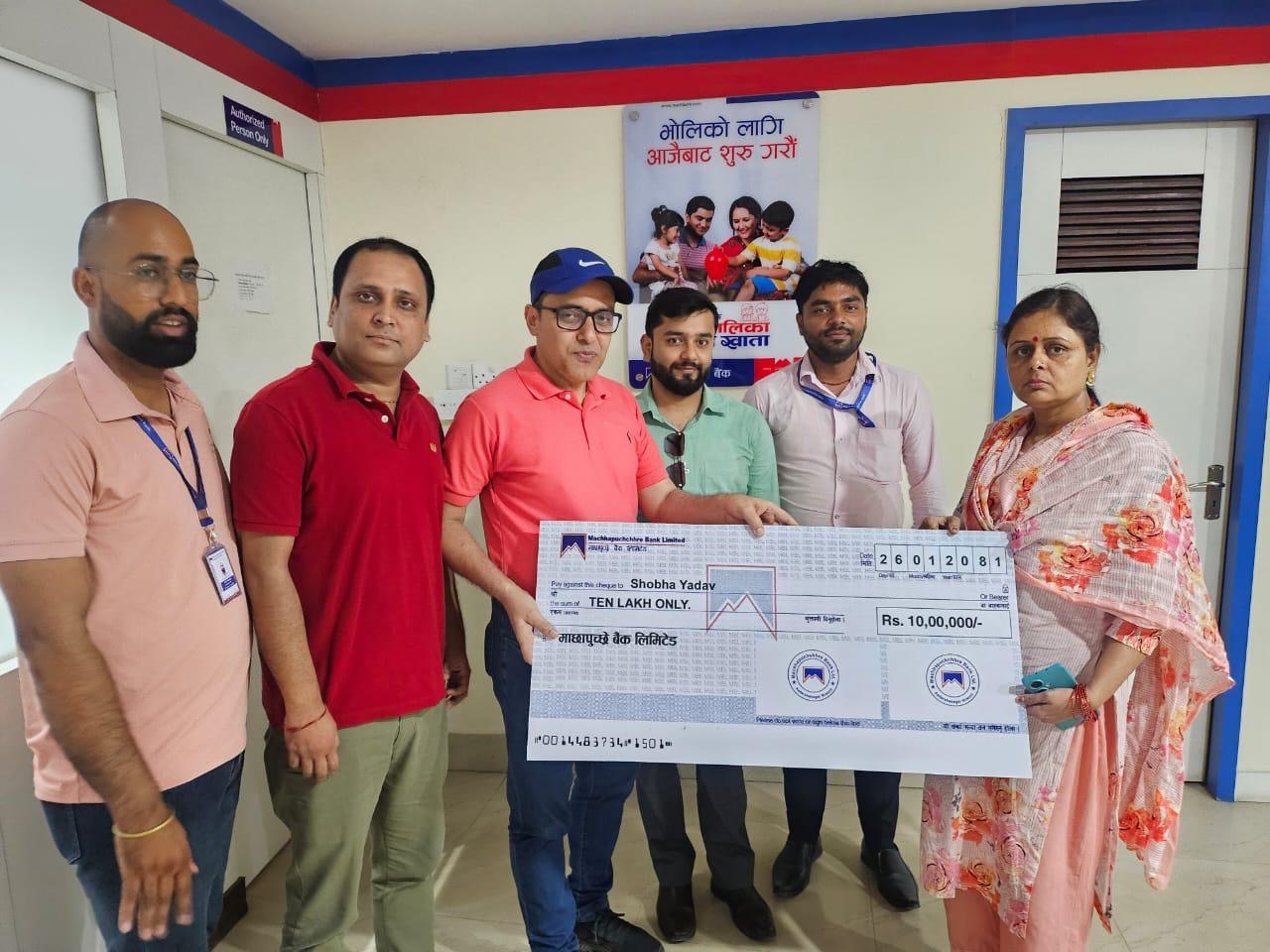 माछापुच्छे बैंकका चिफ बिज़नेस अफिसर श्री डिल्लीराम गिरी, मदेश प्रदेश प्रमुख इन्दु शेखर देवकोटा, आदर्शनगर शाखा प्रमुख सुशिल थपलियाले उक्त मृत्यु दाबी चेक यादवकी श्रीमती सोभा यादवलाई रकमको चेक हस्तान्तरण गरेका हुन्।
